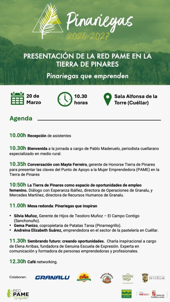 Todo ello lo queremos contar en una jornada en la que vamos a poder conocer experiencias de empleo y de emprendimiento de mujeres (Pinariegas) que pueden servir de inspiración a otras mujeres, vamos a poder conocer oportunidades laborales muy interesantes para las mujeres de nuestra comarca; y tendremos la oportunidad de escuchar una charla motivadora desde la que se lanzarán mensajes aplicables a nivel personal y profesional por los asistentes.